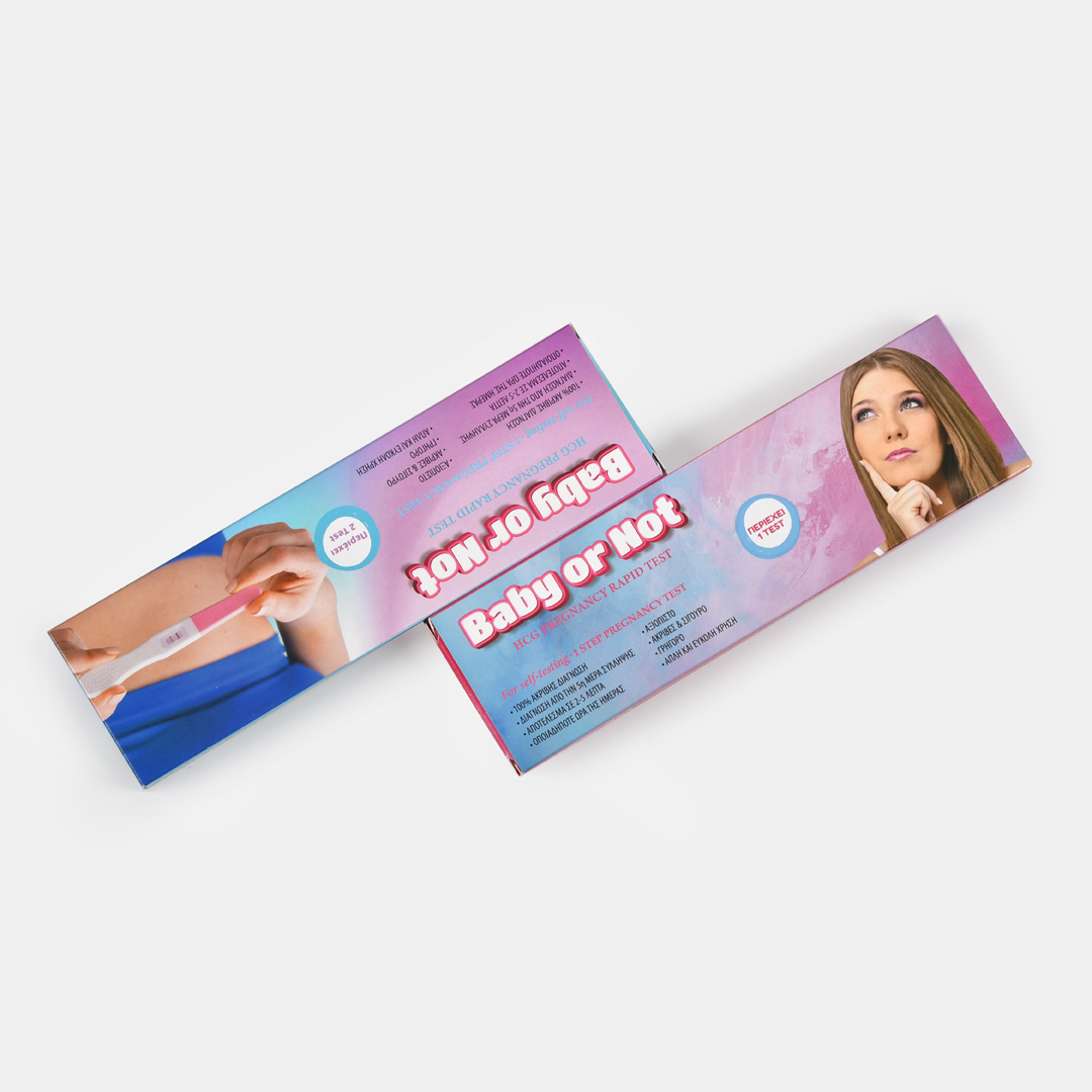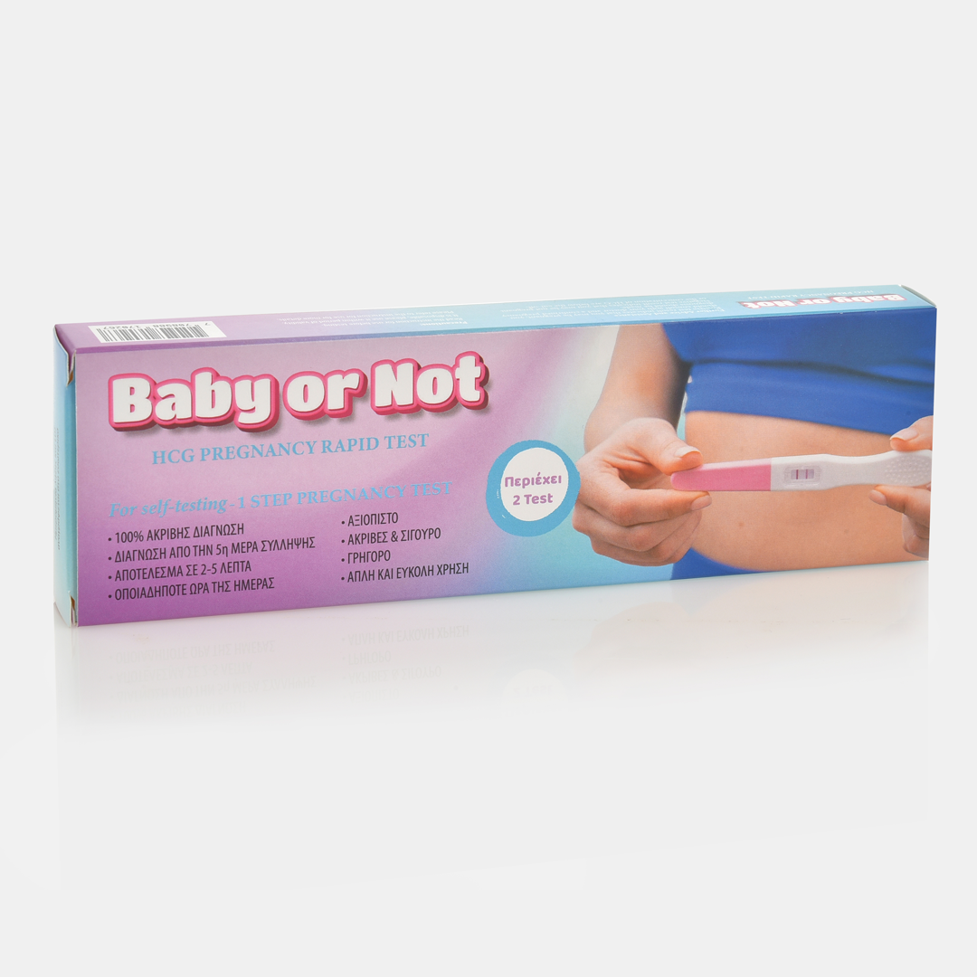 Baby or Not αυτοδιαγνωστικό test εγκυμοσύνης. Ανιχνεύει το ποσοστό της έκκρισης της ανθρώπινης χοριονικής γοναδοτροπίνης HCG στα χαμηλότερα επίπεδα της κλίμακας ήδη από την 5η μέρα της πιθανής σύλληψης, γεγονός που το καθιστά αξιόπιστο και το πλέον ενδεικτικό για χρήση. Αποτέλεσμα σε 2-5 λεπτά, οποιαδήποτε ώρα της ημέρας. Γρήγορη, απλή και εύκολη χρήση. Ακριβές, σίγουρο και ασφαλές με αξιόπιστα αποτελέσματα.